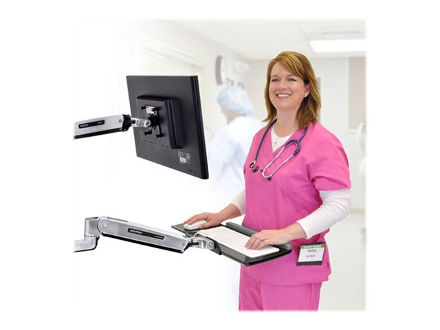 Avec un petit support noir pour l'unité centrale. Il s'agit d'une solution complète qui accueille un écran LCD, un clavier et une unité centrale, créant ainsi un poste de travail informatique assis-debout. Il est parfait pour les espaces restreints : il suffit de replier le clavier et l'écran LCD contre le mur lorsqu'ils ne sont pas utilisés.