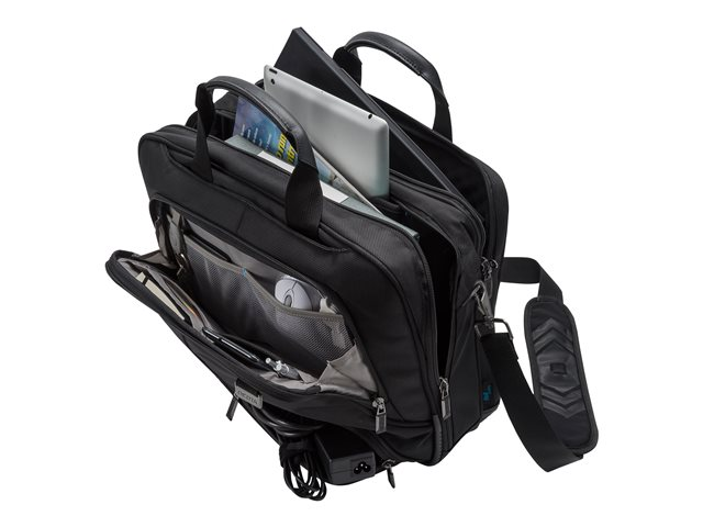 La séparation du système fit-all dans le compartiment ordinateur recouvre votre ordinateur, le protège et s'adapte à sa taille automatiquement. La mousse légère en EVA perforée placée dans le compartiment verrouillable de l'ordinateur, protège parfaitement les angles de votre appareil, avec un énorme gain de poids. Cette sacoche est légère et agréable à porter, grâce à ses poignées en cuir véritable de haute qualité. Le revêtement de technologie anti-glisse assure une tenue optimale de votre ordinateur portable dans le compartiment et de la sangle rembourrée réglable en longueur. Protection idéale pour votre iPad ou tablette dans le compartiment formé en EVA avec doublure extra douce en nylex. Espace de rangement spacieux pour des documents. La poche frontale avec porte-clé et compartiments de rangement organise vos ustensiles personnels et offre de la place pour d'autres accessoires mobiles. Compartiment à fermeture éclair pour papiers d'identité. Lanière de fixation pouvant servir de compartiment supplémentaire pour des documents. Fond du sac en matière étanche.