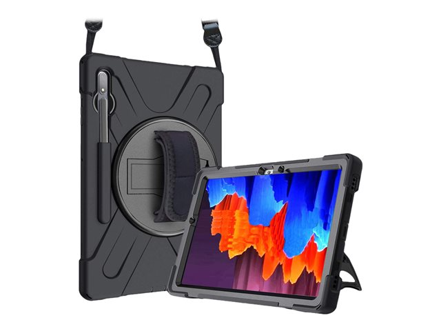 Coque renforcée avec emplacement stylet, bandoulière, poignée rotative et pied support pour Samsung Galaxy Tab S7 FE.