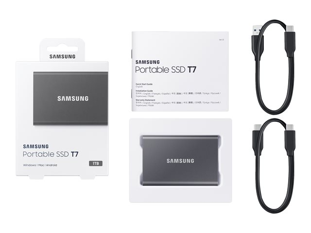 Description du produit Samsung T7 MU-PC1T0T - SSD - 1 To - USB 3.2 Gen 2 Type Lecteur à semi-conducteurs - externe (portable) Capacité 1 To Cryptage matériel Oui Algorithme de chiffrement AES 256 bits Interface USB 3.2 Gen 2 - USB-C Débit de transfert de données 10,0 Gbps (USB 3.2 de 2e génération) Caractéristiques Antichoc, authentification du mot de passe, Dynamic Thermal Guard protection, NVM Express (NVMe), AES 256 bits Source d'alimentation Bus USB Couleur du boîtier Gris titan Dimensions (LxPxH) 85 mm x 8 mm x 57 mm Poids 58 g Garantie du fabricant Garantie de 3 ans -