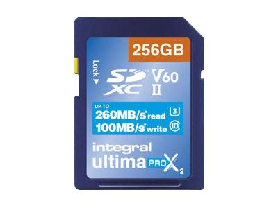 Description du produit Integral UltimaPro X2 - carte mémoire flash - 256 Go - SDXC UHS-II Type du Produit Carte mémoire flash Format Carte mémoire SDXC UHS-II Capacité de stockage 256 Go Indice de vitesse Video Class V60 / UHS-II U3 / Class10 Garantie du fabricant Garantie de 5 ans -