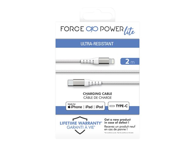 Description du produit Force Power câble Lightning - Lightning / USB - 2 m Câble Câble Lightning - Lightning / USB Longueur 2 m Couleur Blanc Connecteur 24 pin USB-C - mâle Connecteur (deuxième extrémité) Lightning - mâle Courant nominal 3 A Fonctions Synchronisation et charge Garantie du fabricant Garantie limitée à vie -