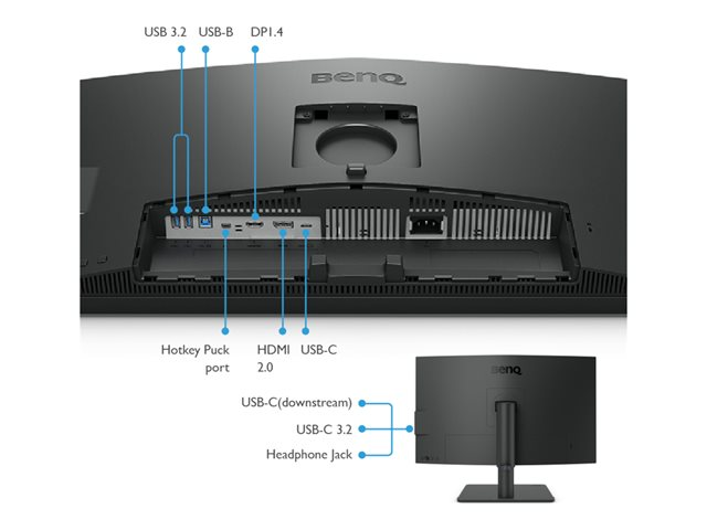 Description du produit BenQ DesignVue PD2706U - Professional Series - écran LED - 4K - 27" - HDR Type de périphérique Écran LCD à rétroéclairage LED - 27" Classe énergétique Classe G Caractéristiques Hub USB, commutateur KVM Type de panneau IPS Facteur de forme 16:9 Résolution native 4K 3840 x 2160 à 60 Hz Luminosité 400 cd/m² Rapport de contraste 1200:1 Compatible HDR HDR10 / DisplayHDR 400 Temps de réponse 5 ms (gris-à-gris) Prise en charge des couleurs 1,07 milliards de couleurs Gamme de couleurs 99% Rec 709, 99% sRGB, 95% P3 Connecteurs d'entrée HDMI, DisplayPort, USB-C Réglages de la position de l'écran Hauteur, pivot (rotation), pivotant, inclinaison Revêtement de l'écran Anti-éblouissement Tension CA 100-240 V Dimensions (LxPxH) - sans base 61.38 cm x 8.77 cm x 36.76 cm Poids 5.3 kg Normes de conformité TUV Rheinland Low Blue Light Certification, TUV Rheinland Flicker Free Certification, HDCP 2.2, Solidworks certification Garantie du fabricant Garantie de 3 ans -